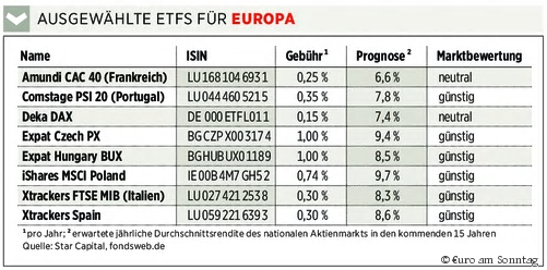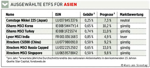 Beim Blick auf die 40 wichtigsten Märkte weltweit zeigt sich, dass es zurzeit große Unterschiede zwischen den einzelnen Ländern gibt. Die Börsen einiger Staaten sind sehr niedrig bewertet, andere sehr hoch. Besonders teuer sind etwa Indien, Dänemark und die USA. Auffallend günstig sind Russland, die Türkei und China. Auf den folgenden Seiten stellt €uro am Sonntag die billigsten Märkte aus verschiedenen Regionen vor und empfiehlt passende ETFs. Zusätzlich erfahren Anleger, wie die bedeutendsten Märkte einer Region einzuschätzen sind.