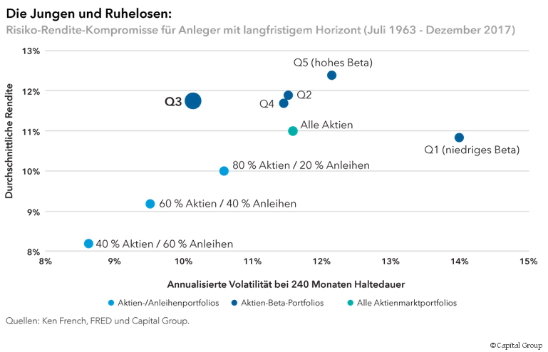 Für diejenigen mit einem längeren Zeithorizont, zum Beispiel für junge Anleger, die den Mumm haben, inmitten von Ausverkäufen auf Kurs zu bleiben, haben zyklischere Aktien mit höherem Beta bessere Ergebnisse erzielt. Aus diesem Grund setzen wir für Anleger zu Beginn des Sparzyklus auf Wachstumswerte in Portfolios.