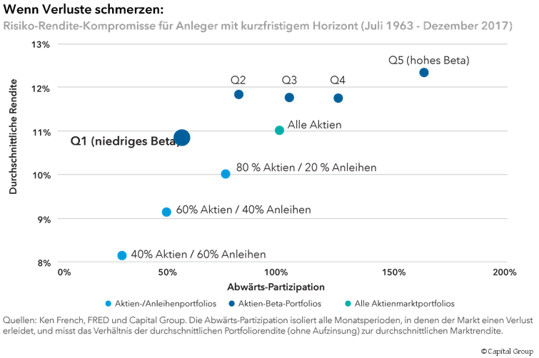 Für Anleger mit einem kürzeren Zeithorizont – wie zum Beispiel solche, die sich kurz vor dem Eintritt in den Ruhestand befinden – haben defensive Aktien mit niedrigerem Beta in Zeiten von Marktstress überlegene Ergebnisse geliefert. Diese Gruppe hat im Vergleich zu einem gemischten Aktien-/Anleihenportfolio und zur bloßen Reduzierung der Aktienallokation zugunsten von Anleihen im Laufe der Zeit einen besseren Schutz gegen Abwärtsbewegungen gezeigt und eine höhere Rendite erzielt.