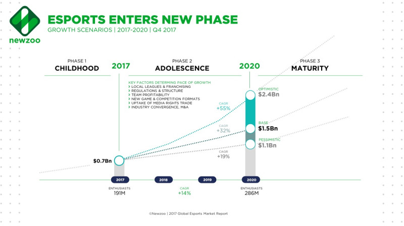 Kein Wunder, dass immer mehr etablierte Unternehmen eSport als Werbeplattform nutzen. Die Informationsplattform Newzoo erwartet, dass das Sponsorship von Global Playern wie Audi, Budweiser, Intel, Gilette, Samsung, Coca Cola etc. bis 2020 auf 655 Mio. US-Dollar ansteigen wird. Der globale eSports-Umsatz - Verkauf von Medienrechten, Werbung, Sponsoring, Merchandising und Ticketverkauf inklusive - ist laut Newzoo 2017 um 41% auf 696 Millionen US-Dollar gewachsen. Bis 2020 soll er auf 1,49 Milliarden US-Dollar ansteigen. Die weltweite eSports-Zielgruppe schätzen sie auf 385 Millionen Menschen.