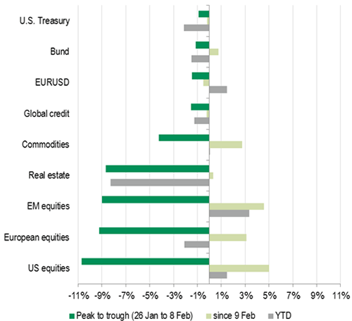 February started with a sharp correction in equity and volatility markets. This was mainly driven by technical rather than fundamental factors as we explained in our previous monthly. As a consequence, the fall was rather sharp, but also short-lived. The S&P 500 index, along with other major equity indices, started to rebound on 9 February. This bounce has been progressive, but also unequal between markets. US equities recovered about half of the ground lost, while European and Japanese equities lagged. Looking at the year-to- date (ytd) performance, US equities are still up while European stocks are down (see Figure 1). Emerging markets on the other hand were hit to a lesser extent by this technical correction and are still benefiting from a weak dollar. Latin America in particular has been performing strongly, up by more than 8% so far this year, with a complete recovery of the early February correction.