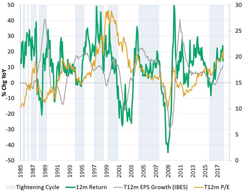 We address this issue by looking at the pattern of US equity returns during past Fed tightening cycles. Figure 3 shows annual returns for the S&P 500 together with valuations (12m forward PEs) and earnings growth.