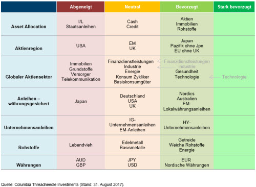 Ein Führungswechsel in einigen Zentralbanken könnte eine Infragestellung der lockeren Geldpolitik, von der Risikoanlagen in den letzten Jahren profitierten, zur Folge haben und das durch langfristig niedrige Zinsen gekennzeichnete Umfeld gefährden. In Europa endet die Amtszeit von Mario Draghi im Oktober 2019, doch er könnte im kommenden Jahr die Führung Italiens anvisieren. Die Amtszeit von Janet Yellen läuft im Januar 2018 aus, ihre Position ist indes bis zu einem gewissen Grad von Präsident Trump abhängig. In Japan ist Notenbankchef Haruhiko Kuroda noch bis April im Amt. Es besteht die Möglichkeit, dass er durch einen Traditionalisten der Bank of Japan abgelöst wird, der zügig zu einer Normalisierung der Geldpolitik übergehen könnte. Wir sind uns bewusst, dass eine beschleunigte geldpolitische Normalisierung seitens der Zentralbanken ernsthafte Auswirkungen auf globale Risikoanlagen haben könnte.