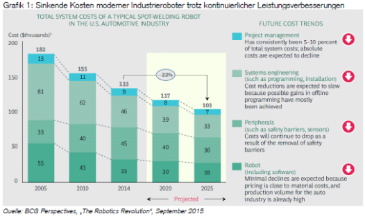 Laut einer Schätzung der Boston Consulting Group (BCG) sanken die durchschnittlichen Kosten eines Punkt-Schweißroboters von USD 182.000 im Jahr 2005 auf nur USD 132.000 im Jahr 2013. Die BCG prognostiziert einen weiteren Rückgang der Kosten und erwartet für 2025 einen Listenpreis im Bereich von USD 103.000. Wie die nachstehende Grafik zeigt, schätzt die BCG, dass die Kosten von Hard- und Software („Roboter, einschließlich Software“) um ca. 40% gesunken sind, während die Kosten für Programmierung, Installation und Integration („Systems engineering“ – Systemtechnik) dank verbesserter „Intelligenz“ des Systems sogar noch stärker gesunken sind.