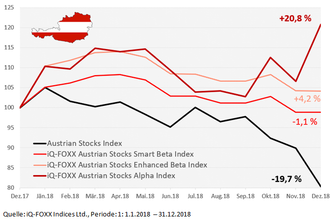 Der österreichische Aktienindex ATX hat im Jahr 2018 rund 20 Prozent an Wert verloren. Der iQ-FOXX Austrian Stocks Alpha Index hingegen konnte das Ergebnis umdrehen und schloss das Jahr 2018 mit einem dicken Plus von 20,8 Prozent ab.