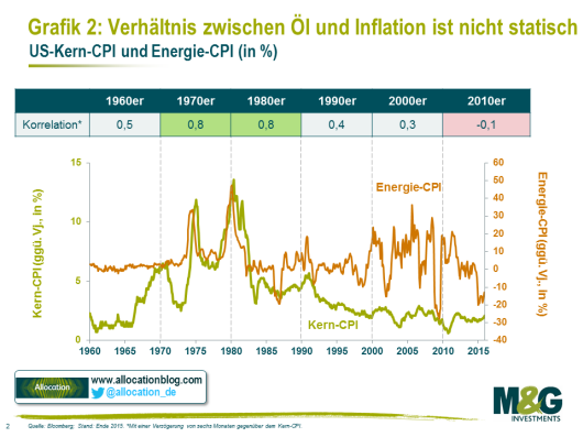 Aber ist dies tatsächlich die Entwicklung, mit der wir es momentan zu tun haben? Und ist diese Tendenz überhaupt gerechtfertigt? Theoretisch wäre eine Korrelation zwischen den Inflationserwartungen und der Entwicklung der Energiepreise durchaus nachvollziehbar. Schließlich handelt es sich auch bei Energie um einen Rohstoff, der sich wegen der Indexbindung der Löhne auf das Gehaltsniveau auswirken kann. Schaut man sich die Daten aber einmal genauer an, so beeinflusst die Tendenz der Energiepreise die zugrunde liegende Inflation mittlerweile nicht mehr so stark, wie dies noch in der Vergangenheit der Fall war. In den USA lässt sich seit 2010 sogar eine neutrale bis moderat negative Korrelation beobachten.