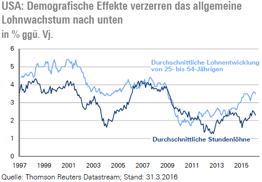 Insofern lässt sich davon ausgehen, dass trotz schwachem Wirtschaftswachstum die Nachrichten vom Arbeitsmarkt auf absehbare Zeit positiv bleiben werden. Dementsprechend bestehen gute Chancen auf einen weiteren Anstieg der Beschäftigtenzahl in den USA (Freitag) von etwa 200.000 im April, einem Rückgang der Arbeitslosenquote (Freitag) sowie auf einen Anstieg der durchschnittlichen Stundenlöhne (Freitag) um 0,3 % zum Vormonat. Dabei sollte jedoch nicht vergessen werden, dass das allgemeine Lohnwachstum durch demografische Faktoren verzerrt ist. So scheiden derzeit ungewöhnlich viele Arbeitnehmer mit hohem Gehaltsniveau (Baby-Boomer) aus Altersgründen aus dem Berufsleben aus, was das allgemeine durchschnittliche Lohnniveau nach unten drückt und zuletzt nur ein Lohnwachstum von 2,3 % ermöglichte.