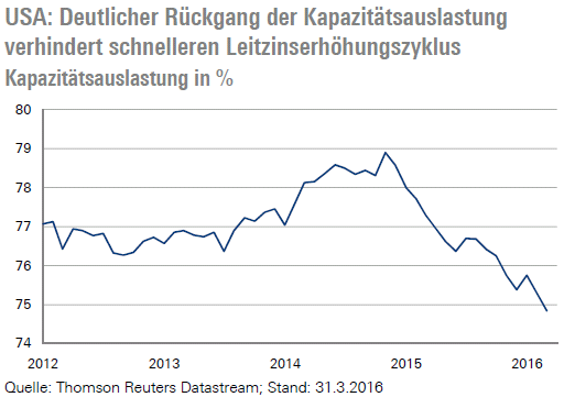 Die US-Notenbankpolitik der vergangenen 30 Jahre lässt sich gut mit nur drei Variablen erklären: Arbeitslosenquote, Trend der Kerninflation und Kapazitätsauslastung der Industrie. Seit November 2014 verzeichnete die Kapazitätsauslastung in der US-Industrie aufgrund des starken US-Dollars und der gefallenen Rohstoffpreise einen dramatischen Rückgang von knapp 79 % auf unter 75 % im März 2016.