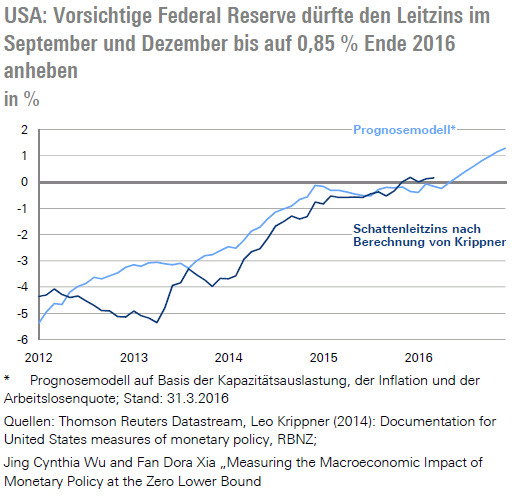Trotz des Rückgangs der Kapazitätsauslastung erhöhte die US-Notenbank im Dezember 2015 den Leitzins auf 0,35 %. Der Grund dafür war die damals sinkende Arbeitslosenquote und die steigende Kerninflation. Seit der Leitzinserhöhung tendieren jedoch die Arbeitslosenquote und die Kerninflation nur seitwärts, was in Kombination mit der fallenden Kapazitätsauslastung einen Rückgang des vom Prognosemodell geschätzten Leitzinses von etwa 0,0 % im Februar auf -0,25 % im April 2016 zur Folge hatte. Aufgrund der einsetzenden Wachstumsbeschleunigung ist in den kommenden Monaten davon auszugehen, dass die Arbeitslosenquote sinkt und die Kapazitätsauslastung steigt. Dementsprechend steht unsere Prognose zweier weiterer Leitzinserhöhungen im September und Dezember auf 0,85 % im Einklang mit den erwarteten Fundamentaldaten.