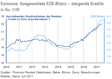 Aufgrund der anhaltenden EZB-Bilanzexpansion und der guten Konjunktur dürfte die Kreditvergabe (Montag) im Juli merklich gestiegen sein. Eine steigende Kreditvergabe geht tendenziell mit einer steigenden Inflation (Donnerstag) einher. Auch wenn es diesmal länger dauert – die Inflation befindet sich auf einem moderaten Aufwärtstrend.