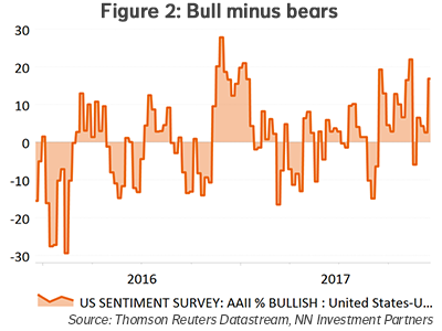 Indeed, while scaling the wall of worry in 2017 we came close to a “goldilocks” scenario. Macro data improved, earnings growth was strong, business and consumer confidence soared and the lack of inflation kept central banks on a very gradual tightening path. The Eurozone Political overcame political hurdles and the US government delivered its first big election promise: a USD 1.4 trillion tax cut boosting corporate profits. The real economic impact remains to be seen, but we do not expect a big growth push. Despite all this, investors remained relatively cautious and signs of exuberance were not widespread.