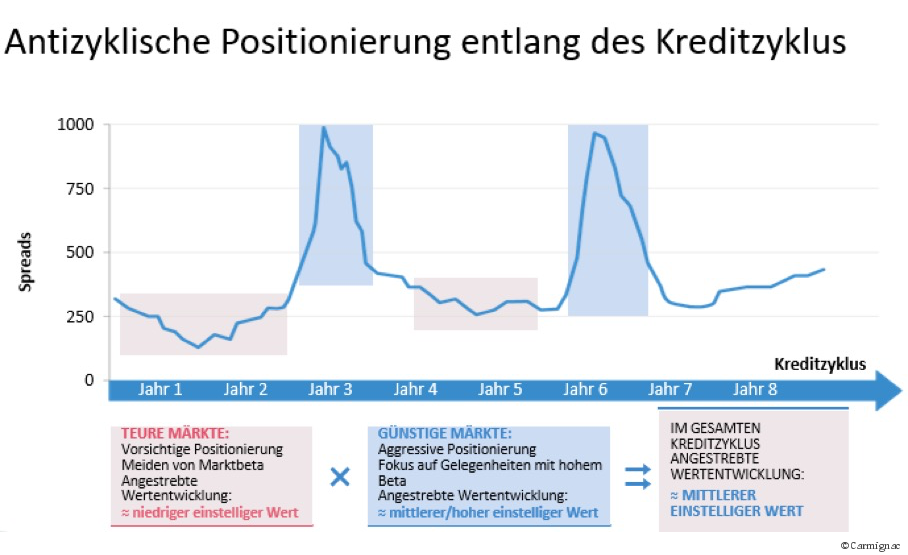 Pierre Verlé, Rentenspezialist bei Carmignac, hat sich mit diesem Dilemma intensiv auseinandergesetzt und nach Lösungen gesucht. Als Verantwortlicher für die Credit-Strategie der Multi-Asset-Fonds der französischen Fondsgesellschaft tüftelte er eine Strategie aus, die schließlich dazu führte, dass der Anleiheanteil innerhalb der Multi-Asset-Fonds mittlerweile einer der erfolgreichsten Bausteine ist. Sein Trick: Er kehrte die klassische Rentenstrategie um. Er erhöhte das Kreditrisiko bei günstigen und reduzierte es bei hohen Bewertungen. Der Effekt: Mit seiner Strategie kann er eine attraktive risikobereinigte Rendite über den kompletten Kreditzyklus hinweg erwirtschaften.