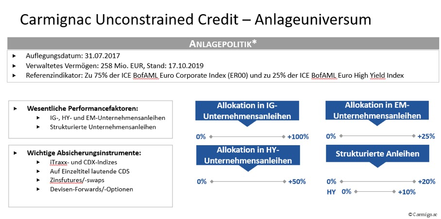 Pierre Verlés Strategie überzeugte das Management der Fondsgesellschaft in Paris so sehr, dass die Gründerfamilie sich entschied, den Carmignac Portfolio Unconstrained Credit aufzulegen – auch unterlegt mit eigenem Vermögen. Mit dem vor etwa eineinhalb Jahren aufgelegten Fonds, der zunächst nur als institutionelle Anteilsklasse mit einem Mindestinvestitionsvolumen von zwei Millionen Euro verfügbar ist, kann Verlé nun seine Rentenstrategie unabhängig vom Multi-Asset-Bereich umsetzen. Zusammen mit Alexandre Deneuville und Florian Viros, einem ausgewiesenen Experten im Bereich strukturierter Anleihen, setzt das erfahrene Management-Team auf Einzeltitel. Dabei können sich die Fondsmanager in einem großzügig abgesteckten Anleiheuniversum bewegen. Bis zu 25 Prozent der Papiere können in Anleihen aus den Emerging Marktes investiert werden, bis zu 50 Prozent an Hochzinsanleihen, bis zu 100 Prozent an Investment-Grade-Anleihen und bis zu 20 Prozent an strukturierten Produkten sind möglich. Es ist ein in Euro abgesichertes Portfolio und unterliegt somit keinem Währungsrisiko.