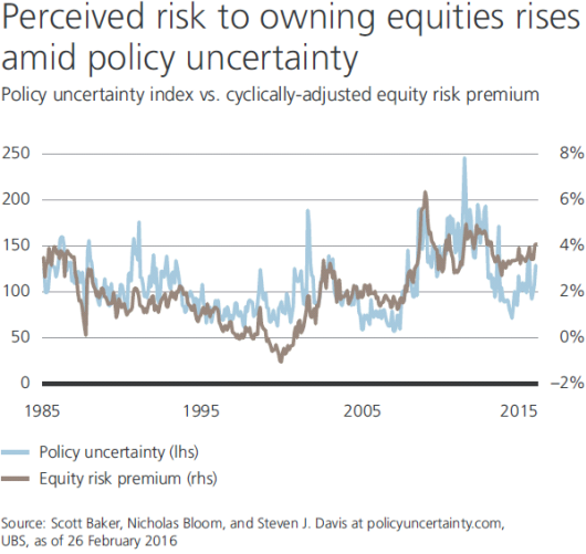 The figure to the left shows a quantitative measure of policy uncertainty developed by social scientists at Stanford University and the University of Chicago. Current policy uncertainty is muted, and the perceived risk of owning stocks versus bonds (equity risk premium) is high. US equities look attractively valued compared to bonds, though not as starkly as they did during recent spikes in policy uncertainty.