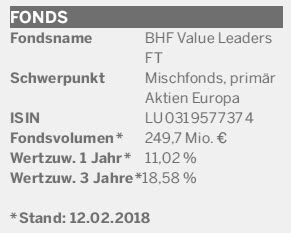 Der überwiegend in Aktien anlegende Mischfonds BHF Value Leaders FT erzielte in den vergangenen fünf Jahren kumuliert einen Wertzuwachs um 66,58 Prozent. Das kann sich sehen lassen. Nun geht es darum, die Strategie zu überprüfen und anzupassen. Denn der Wind dürfte im laufenden Jahr 2018 insgesamt wohl etwas rauer werden. Fondsmanager Stefan Diehl sieht jedoch noch Potenzial, insbesondere bei europäischen Aktien.