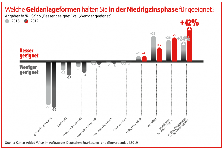 Aktien sind die beliebteste Geldanlage der Deutschen. Das ist das Ergebnis einer aktuellen repräsentativen Umfrage, die der Deutsche Sparkassen- und Giroverband (DSGV) zum Weltspartag durchgeführt hat. Immobilien- und Investmentfonds landen auf Platz zwei, Immobilien auf Platz drei. Aktien, Direktinvestitionen in Unternehmen und Wertpapiere werden laut Studie mit Blick auf die anhaltend niedrigen Zinsen als attraktiver angesehen als bisher. Immobilien werden zwar mehrheitlich immer noch als geeignet angesehen, doch zeigt sich aufgrund der deutlich gestiegenen Immobilienpreise hier eine stark rückläufige Tendenz.