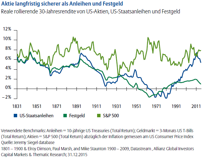 „Definiert der Anleger Sicherheit nicht als Abwesenheit von Kursschwankungen, sondern als Kaufkrafterhalt, das heißt unter Einbeziehung der Inflation, so waren Aktien in der Historie über einen langen Anlagehorizont von 10 Jahren oder mehr sogar sicherer als Anleihen. Bei der Analyse der 10-jährigen rollierenden Durchschnittsrenditen im Zeitraum der letzten 215 Jahre waren die negativen Ausreißer für Aktien im Vergleich mit kurz- und langlaufenden Staatsanleihen sogar geringer.“