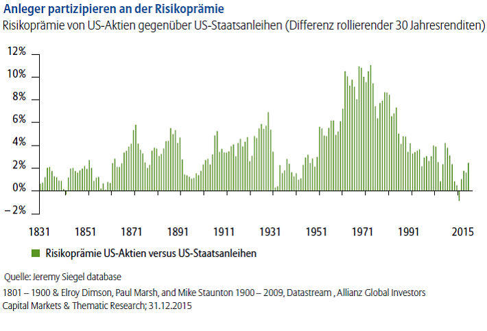 Welchen Effekt Risikoprämie und Zinseszinseffekt über einen langen Zeitraum haben können, erläutert Naumer an einem Beispiel: „Angenommen, ein Investor hätte im Jahr 1801 einen US-Dollar in US-Staatsanleihen investiert, so hätte er bis Ende 2015, kaufkraftbereinigt, etwas über 1.550 US-Dollar erzielt, ein Investment in Aktien hätte ihm im gleichen Zeitraum zu mehr als 1,4 Millionen verholfen.“