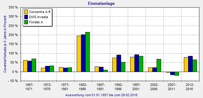 Der Fondak A (ISIN: DE0008471012) stammt etwa aus derselben Generation wie der DWS Investa, schafft seit 1950 aber eine Wertsteigerung von 62.642,3 Prozent. Der 1,8 Milliarden Euro schwere Fonds verliert 2016 bisher 12,5 Prozent. Insgesamt trägt er die FondsNote 3. Auf dem dritten Platz landet der Concentra A (ISIN: DE0008475005). Auch er wurde 1956 aufgelegt. Anleger der ersten Stunde erhalten einen Wertzuwachs von 14.453,7 Prozent. Gleichzeitig trägt der Fonds die FondsNote 2. Doch auch den Concentra hat es 2016 kalt erwischt. Mit 13,4 Prozent steht der zwei Milliarden Euro schwere Fonds derzeit in den roten Zahlen.