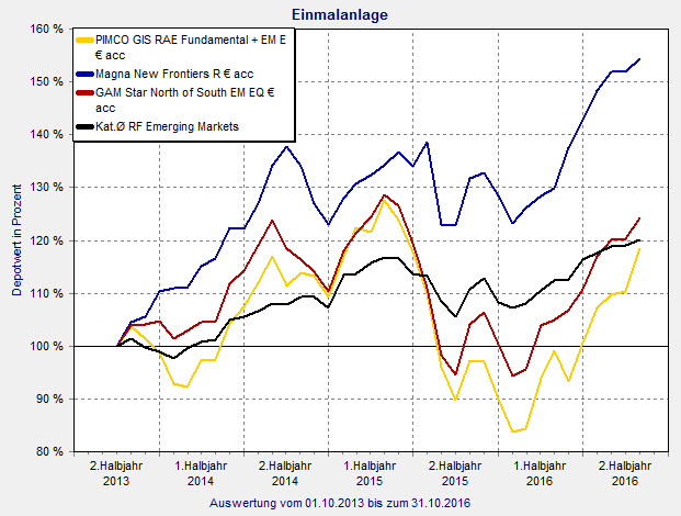 Es hätte so schön sein können: „Nach einem starken Einbruch im Januar profitierten Schwellenländer von einem günstigeren Wirtschaftsklima und verzeichneten nach dem Rekordtief im Januar eine deutliche Erholung“, schrieben die Analysten von Carmignac Ende Oktober. „Grund hierfür waren gestiegene Rohstoffpreise, ein schwächerer US-Dollar, ein expansiverer Kurs der Fed und ein allgemein verbessertes wirtschaftliches Umfeld in China.“ Auch das Multi-Manager-Team von Schroders war im Oktober noch zuversichtlich: „Schwellenländeraktien werden gegenüber Industrieländern mit einem deutlichen Abschlag gehandelt, nachdem sie in den letzten Jahren auf Basis der Fundamentaldaten berechtigterweise eine Underperformance verzeichneten. Inzwischen sind sie günstiger, weisen bessere Fundamentaldaten auf und es wird zu wenig in sie investiert. Somit stellen sie eine interessante Anlageklasse für uns dar.“ Maarten-Jan Bakkum, Senior Emerging Markets Strategist bei NN Investment Partners, hatte zwar einige Einschränkungen: „Das wiedererwachte Interesse der internationalen Investoren beruht zumeist weniger auf eigener Stärke der Schwellenländer, sondern vor allem auf der lockeren Geldpolitik und sinkenden Zinsen in den Schwellenländern selbst.“ Dennoch rechnete auch er mit guten Gelegenheiten: „Nach sechs Jahren stetigen Abschwungs dürften davon insbesondere die dortigen Aktienmärkte profitieren.“ Und die Zahlen geben den Experten bisher Recht: Per 31. Oktober landet die Kategorie Aktienfonds Emerging Markets mit einem Zuwachs von 11,1 Prozent auf Platz zwölf von 123. 2015 erzielte die Peergroup dagegen nur ein leichtes Plus von 0,9 Prozent. Fonds wie der PIMCO GIS RAE Fundamental (ISIN: IE00BDS00574) erzielen im laufenden Jahr bisher ein Plus von 31,7 Prozent. 2015 stand der Fonds noch mit 17,8 Prozent im Minus. Auch Fonds wie der Magna New Frontiers (ISIN: IE00B68FF474) können überzeugen: Er glänzt nicht nur mit der FondsNote 1, welche das Rendite-Risiko-Verhältnis über vier Jahre misst. Im laufenden Jahr können sich Anleger zudem über einen Zuwachs von 20,1 Prozent freuen. 136 Millionen Euro sind derzeit in den Fonds investiert.