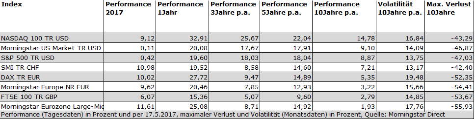 Quelle: Morningstar. Die Tabelle liefert eine Übersicht über die Performance einiger einschlägiger Indizes in den vergangenen Jahren.