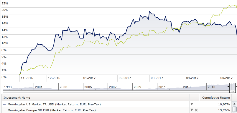 Doch die Morningstar-Untersuchung zeigt auch: Wer in Deutschland, der Schweiz oder Österreich heimische Aktien übergewichtet hat, muss nicht traurig sein. Zumindest seit dem vergangenen November, seitdem Donald Trump zum US-Präsidenten gewählt wurde, hat sich der langjährige Trend umgekehrt. Hoben US-Aktien und der US-Dollar zunächst infolge einer allgemeinen Trump-Euphorie über erwartete Steuerreformen und Konjunkturprogramme zu einem weiteren Höhenflug an, so ging US-Aktien seit Anfang März 2017 erkennbar die Puste aus. Seitdem sind US-Aktien und der Dollar gegenüber europäischen Aktien und dem Euro und Schweizer Franken deutlich zurückgefallen.