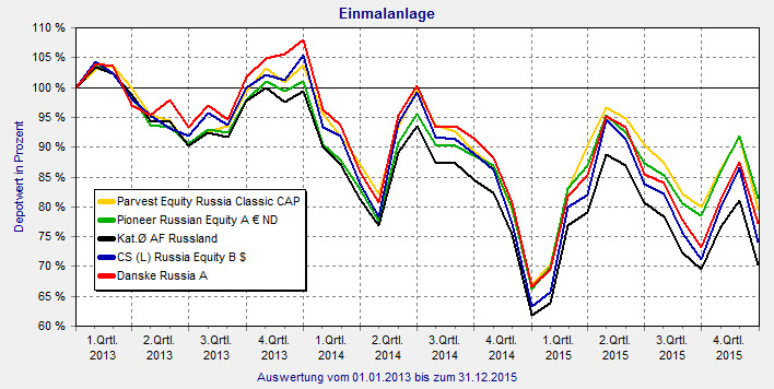 Hat die gesamte Kategorie 2014 mit roten bis tiefroten Zahlen abgeschlossen, hat sich 2015 das Blatt über das Jahr vollständig gedreht. Auch wenn Fonds zwischenzeitlich starken Schwankungen unterworfen waren, kein Fonds der Kategorie verliert 2015 an Wert. Den geringsten Zuwachs verzeichnet der CS (L) Russia Equity BH (ISIN: LU0348404079). Der rund 60 Millionen Euro schwere Fonds erzielt im abgelaufenen Jahr ein Plus von 4,9 Prozent. Seit seiner Auflegung 2009 verliert er jedoch 23,6 Prozent seines Wertes.