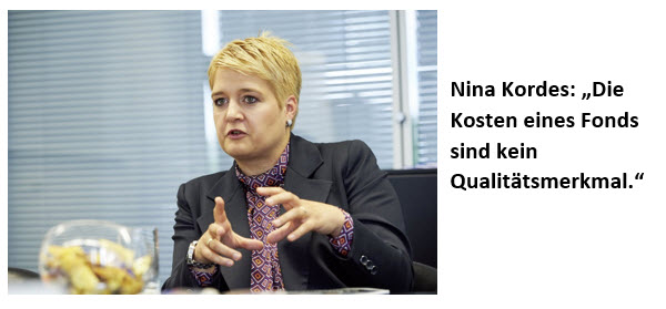 Nina Kordes: Jedes dieser beiden Instrumente hat seinen eigenen Zweck und wird dementsprechend in unsere Gesamtstruktur integriert. Es geht aber nicht nur um die Kosten eines Fonds: Qualität lässt sich nicht in Kosten messen. Es ist viel wichtiger, darauf zu achten, was nach den Kosten übrig bleibt. Das bedeutet: ETFs oder Fonds sollten nicht nur über die Kosten, sondern auch über die die Anlagestrategie, die Performance und natürlich ihre Zielmärkte miteinander verglichen werden. Beide Instrumente sind sinnvolle Bausteine.