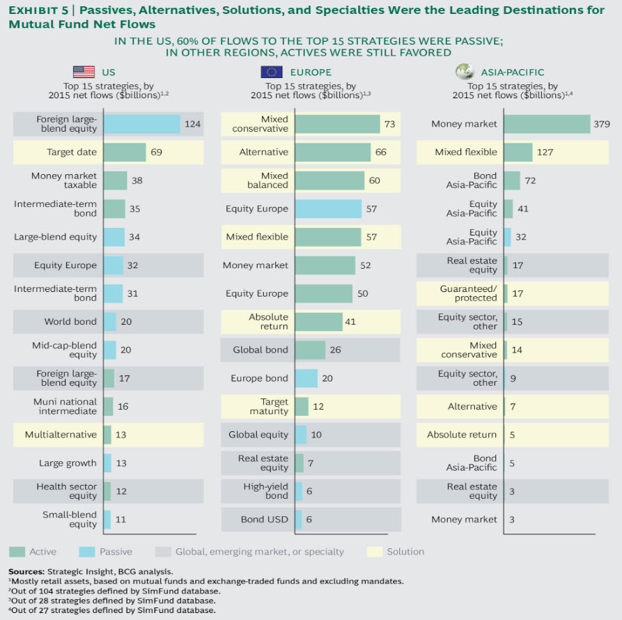 Besonders in den USA könne man einen starken Trend zu passiven Investments beobachten. „Von den 15 Investmentfondskategorien mit den höchsten Nettozuflüssen, waren acht passiv.“ Auch in Europa konnten passive Investmentlösungen ein solides Wachstum hinlegen. „Wir glauben, dass die Verschiebung der Präferenzen von Investoren zu passiven Lösungen traditionelle, aktive Produkte weiter verdrängen wird.“