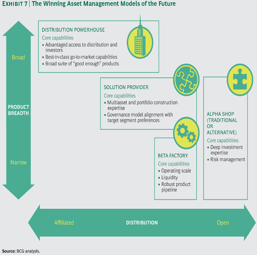Wer in Zukunft gut aufgestellt sein will, der müsse vor allem in Sachen neuer Technologien nachrüsten. „Die Welle an neuen Technologien, Techniken und Daten bringt viele Vorteile.“ Zum einen ein Wissensvorsprung, zum anderen eine bessere Risikokontrolle. Vier Geschäftsmodelle seien für die Zukunft besonders gut aufgestellt, so die Analysten: Spezialisierte Alpha-Shops (Fähigkeit Alpha zu generieren, gepaart mit langer Erfahrung in spezifischen Assetklassen und Investmentstrategien), Beta-Fabriken (gekennzeichnet durch Liquidität und Größe), Solution-Anbieter (Fähigkeit Lösungen für die Multi-Asset-Portfolio-Konstruktion, Asset-Allocation und Managerauswahl sowie Monitoring anzubieten) und Distribution-Kraftwerke (Zugang zu Distribution und Investoren).