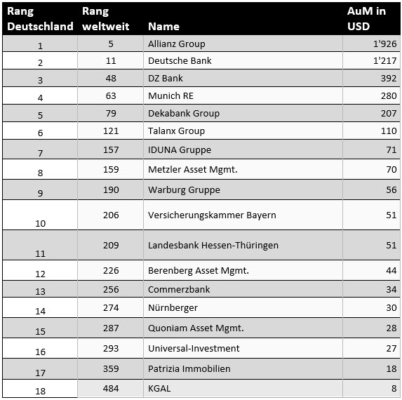 Trotz des Erfolges reicht der neue Meilenstein noch nicht für den Griff nach den Sternen. Der größte deutsche Asset Manager, die Allianz Gruppe, verwaltet umgerechnet gut 1.554 Mrd. Euro. Auf Platz zwei rangiert die Deutsche Bank mit gut 982 Mrd. Euro. Platz 18 belegt die KGAL mit 6,5 Mrd. Euro.
