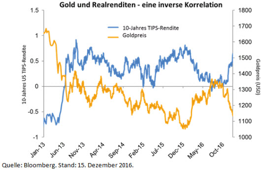 Für wertorientierte Anleger und solche mit Tendenzen „gegen den Strom zu schwimmen“ bietet die jüngste, von US-Wirtschaftsdaten und insbesondere durch den Ausgang der US-Wahlen ausgelöste Dynamik der steigenden Realrenditen und eines stärkeren Dollars einige überzeugende Chancen. Die inverse Korrelation zwischen Realrenditen und dem Goldpreis ist gut dokumentiert, und in den letzten Monaten war diese Beziehung ein zentraler Faktor für Goldpreisbewegungen. Nachdem dieser Ende 2015 in eine neue Bullenphase eingetreten war und im Laufe des Jahres 2016 an Dynamik gewonnen hatte, fiel der Goldpreis in den vergangenen Monaten, da reale Rentenrenditen im Vorgriff auf die Leitzinserhöhung der US-Notenbank gestiegen waren.