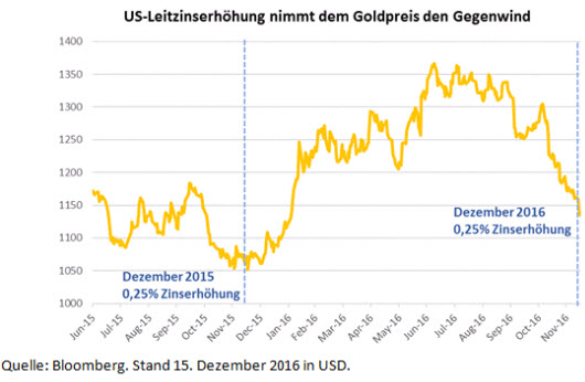 Es scheint, dass viele Anleger den Goldsektor im Vorfeld der Dezember-Fed-Ankündigung gemieden haben und es vorzogen, bis nach der Zinserhöhung in Wartestellung zu bleiben. Wir sehen eine gewisse Ähnlichkeit mit der Performance von Gold im Vergleich zur vorherigen Zinserhöhung der Fed im Dezember 2015; zu dem damaligen Zeitpunkt fiel der Goldpreis auch deutlich im Vorfeld der US-Leitzinserhöhung von 0,25%, um dann über 200 US$ während der drei Monate nach dem Anstieg zu steigen.
