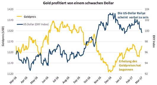 Gold und Goldaktien traten 2016 in eine Erholungsphase ein, aber zum Ende des Jahres korrigierte der Sektor scharf nach unten, da ein steigendes Zinsniveau und Spekulationen über US-amerikanische Konjunkturmaßnahmen nach der Wahl von Donald Trump erwartet wurden. Da diese Faktoren nun weniger Gewicht haben glauben wir, dass die wirtschaftlichen und markttechnischen Rahmenbedingungen für die nächste Phase der Erholung des Goldsektors günstig sind. Anhaltend niedrige Realzinsen, fortwährende Stimuli einiger Zentralbanken, der weltweit hohe Verschuldungsgrad, die laufenden Wirtschaftskrisen in Teilen Europas, Inflationsängste und eine weiterhin starke physische Nachfrage für Gold, vor allem in Asien, bleiben Wertetreiber des steigenden Goldpreises. Darüber hinaus stellt der ausgesprochen unsichere geopolitische Ausblick starke zusätzliche Anreize für Investoren dar Gold zu halten.