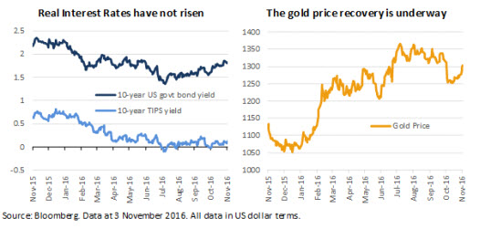 Ein besonders besorgniserregendes Signal für Investoren ist der Anstieg der US-Inflationserwartungen zu einer Zeit, in der die Wirtschaftswachstumserwartungen weiterhin deprimierend sind. Inflationsgebundene US-Staatsanleihen beleuchten das Problem der US-Wirtschaft. Die 10-jährige TIPS-Rendite bleibt in der Nähe der historischen Tiefststände und zeigt wenig Anzeichen für einen Aufwärtsschwung. Da die TIPS-Rendite automatisch auf die Inflation abgestimmt ist, würde eine steigende Rendite eine konjunkturelle Stärkung der Konjunktur zur Folge haben. Stattdessen seiht man der TIPS-Rendite, dass die realen Sätze im vergangenen Jahr gesunken sind. Selbst mit der weithin erwarteten Zinserhöhung der US-Notenbank im Dezember werden die realen Zinssätze in der Nähe der historischen Tiefstände bleiben.