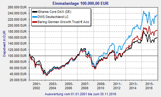 Besonders erfolgreich in den vergangenen zehn Jahren war der DWS Deutschland LC (ISIN: DE0008490962). 148 Prozent, also 9,1 Prozent p.a., erzielte der Fonds zum 30. November 2016. Das 5,7 Milliarden Euro große Fondsvermögen wird vor allem in deutsche DAX-Werte, aber auch in ausgewählte Small- und Mid-Caps investiert. Im laufenden Jahr gibt es immerhin ein Plus von 0,4 Prozent. Auch der Baring German Growth Trust (ISIN: GB0008192063) kann sich mit einem Plus von 93,8 Prozent (6,8 Prozent p.a.) in zehn Jahren sehen lassen. Das Fondsvermögen in Höhe von 485,4 Millionen Euro wird größtenteils in Aktien von Unternehmen investiert, die an den deutschen Wertpapiermärkten notiert sind, ihren Sitz in Deutschland haben oder den überwiegenden Teil ihrer wirtschaftlichen Aktivität in Deutschland ausüben. 2016 steht jedoch noch ein Minus von rund drei Prozent zu Buche.