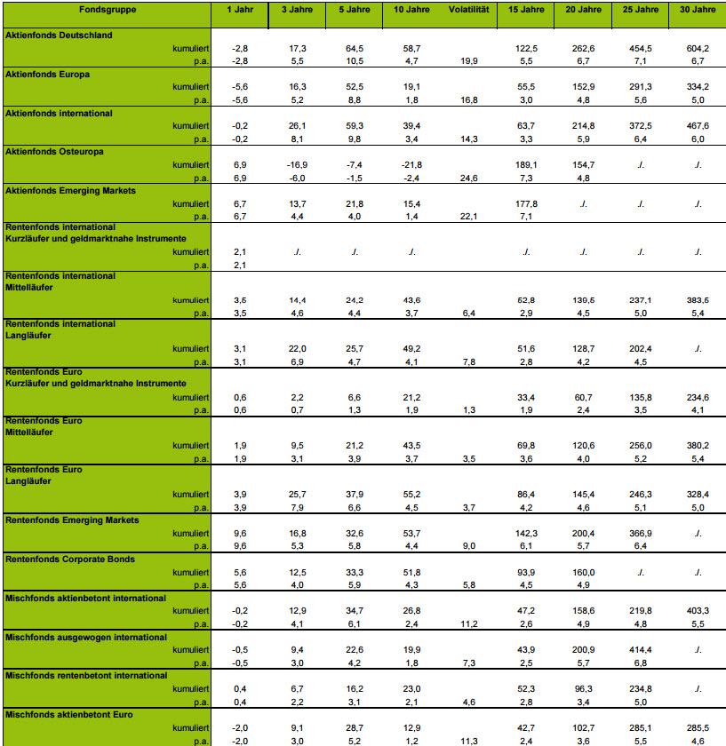 Per 31. Oktober 2016 verlieren Anleger mit Aktienfonds Deutschland im laufenden Jahr zwar 2,8 Prozent, wer aber zehn Jahre Geduld hatte, wird mit einem Plus von 58,7 Prozent belohnt. Per anno macht das 4,7 Prozent. Mehr Rendite in zehn Jahren schafft keine andere Fondskategorie der BVI-Auswertung. Lediglich Rentenfonds Euro Langläufer kommen mit 55,2 Prozent in zehn Jahren nah dran. Mischfonds können im laufenden Jahr gut abschneiden, müssen sich langfristig jedoch auch Aktienfonds Deutschland geschlagen geben.