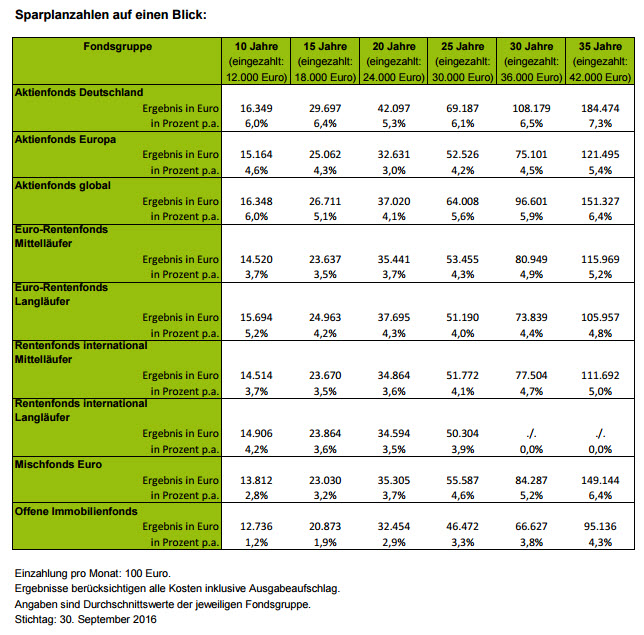 Noch mehr können Anleger rausholen, wenn Sie über einen bestimmt Zeitraum regelmäßig Geld in Fonds einzahlen. Hätte beispielsweise ein Sparer über zehn Jahre bis zum 30. September 2016 jeden Monat 100 Euro in Aktienfonds Deutschland investiert, dann könnte er oder sie sich heute über eine jährliche Rendite von sechs Prozent freuen. Aus 12.000 Euro werden dann mal eben 16.349 Euro. Denselben Effekt hat ein Sparplan auf Aktienfonds global. Aktienfonds Europa bringen Anlegern im selben Zeitraum eine jährliche Rendite von 4,6 Prozent. Während keine Fondskategorie in der Auswertung über einen Zeitraum von zehn oder mehr Jahren ein negatives Ergebnis erzielt, zeigt sich vor allem eins: Anleger waren mit Aktienfonds Deutschland bisher gut beraten.