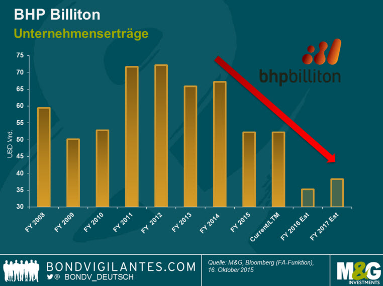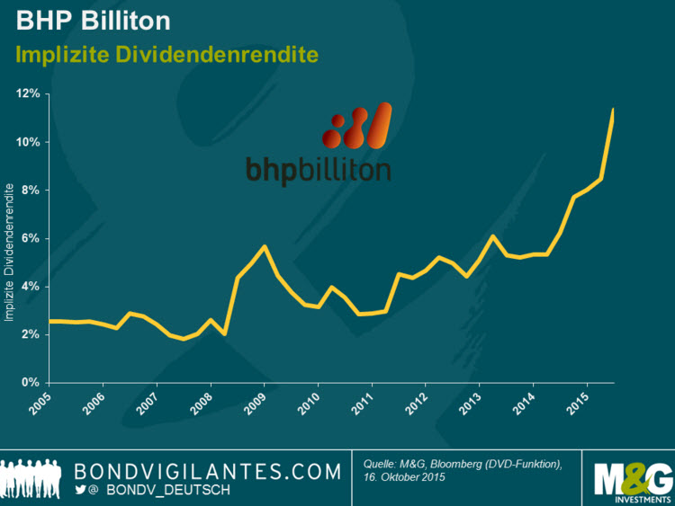 Im Mai 2015 gliederte BHP bestimmte Vermögenswerte in ein Neugeschäft aus – das Bergbau- und Metallunternehmen South32 – und versicherte den Investoren, dass die Dividende der Unternehmensvorgabe weiter folgen werde und „stetig erhöht oder zumindest die Dividende pro Aktie beibehalten“ würde. Angesichts der gegenwärtigen Preise und trotz erheblicher Kosteneinsparungen wird die Einhaltung besagter Dividenden dazu führen, dass sich das Unternehmen mit einem freien Cashflow von -2,5 Mrd. USD konfrontiert sieht. Da es zurzeit nicht gerade danach aussieht, dass sich die Rohstoffpreise in nächster Zeit erholen werden, und da das Unternehmen dem A-Rating verpflichtet ist, scheint sich das Management eigenhändig in die Enge getrieben zu haben. Der Aktienmarkt beobachtete mit Skepsis, wie die implizite Dividendenrendite in 2014 und 2015 deutlich gestiegen ist und nun im Bereich von 10% liegt.