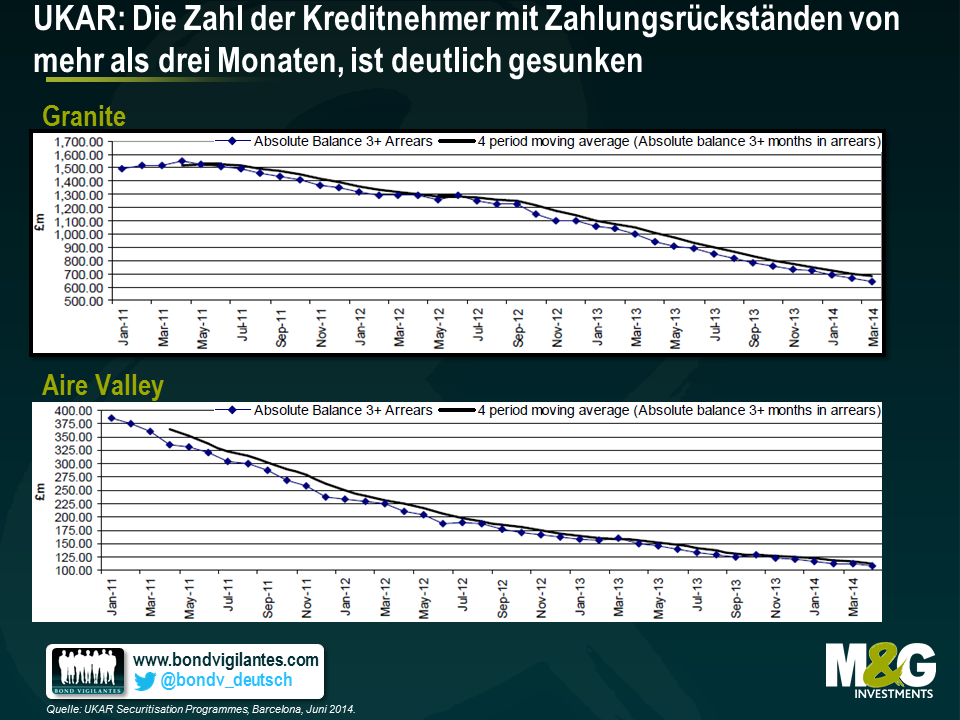 Die U.K. Asset Resolution (UKAR) wurde Ende 2010 als Holdinggesellschaft von Bradford & Bingley (B&B) sowie NRAM – jenem Teil von Northern Rock, der seinerzeit in staatlichem Besitz bleiben sollte – gegründet. Im Gegensatz zu anderen „geretteten“ Instituten wie etwa der RBS und Lloyds, über deren Fortschritte wir durch die Medien nur allzu genau auf dem Laufenden gehalten werden, hat man der UKAR bisher weniger Aufmerksamkeit geschenkt. Damit Sie einmal eine Vorstellung von dem Umfang dieser Rettung erhalten: Obwohl die Tochtergesellschaften seit 2008 keine Hypotheken mehr vergeben haben, ist die UKAR mit einer Bilanzsumme von 74 Mrd. Pfund nach wie vor der siebtgrößte Hypothekenfinanzierer Großbritanniens. Bei rund einem Drittel der Vermögenswerte, welche die UKAR in ihrer Bilanz führt, handelt es sich um besicherte RMBS-Papiere – „Altlasten“ der beiden Gesellschaften Aire Valley (B&B) und Granite (Northern Rock). Weitere 26 Prozent der Vermögenswerte entfallen auf unbelastete Hypotheken; 22 Prozent sind Covered Bonds.