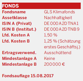 Seit 2013 hat die GLS drei nachhaltige Fonds initiiert: den GLS Bank Aktienfonds (ISIN: DE000A1W2CK8), der branchenübergreifend in nachhaltig orientierte Unternehmen investiert, den GLS AI – Mikrofinanzfonds (ISIN: LU1309710678), der die finanzielle Inklusion der Menschen weltweit vorantreibt, und den GLS Bank Klimafonds (siehe unten) als Mischfonds für klimafreundliche Projekte.