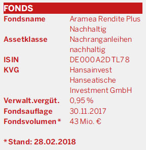 Ende vorigen Jahres hat der hanseatische Asset-Manager einen neuen Fonds in diesem Sektor aufgelegt: den ARAMEA Rendite Plus Nachhaltig, der überwiegend in Papiere von Banken, Versicherungen sowie Industrieunternehmen investiert und sich in der Anlagestrategie an dem erfolgreichen Fonds Aramea Rendite Plus (ISIN: DE 000 A0N EKQ 8) orientiert. Anleger können sich seit dessen Auflage 2009 über eine Wertsteigerung um 155,5 Prozent und eine Rendite von durchschnittlich 11,1 Prozent pro Jahr freuen.
