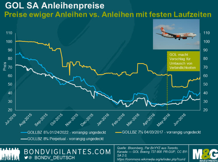 GOL sah sich seit 2012 mit einem erheblichen makroökonomischen Gegenwind (Rezession und Währungsabwertung) konfrontiert, der für eine der größten Fluggesellschaften in Brasilien zu einer niedrigeren Nachfrage, industriellen Überkapazitäten und Finanzproblemen geführt hat. Gemäß dem verschlechterten Kreditprofil folgte eine Abwertung von GOL durch die Ratingagenturen. Das Rating der ewigen ungedeckten Anleihen war nun erneut ähnlich dem Rating anderer ungedeckter Anleihen mit fester Laufzeit. Im Mai 2016 wurden GOL‘s Liquiditätsposition und Bilanz untragbar und das Unternehmen begann mit der Formulierung eines Umstrukturierungsvorschlags. Die private Restrukturierung machte den Inhabern von Anleihen den Vorschlag, ihre Anleihen in neu begebene Anleihen und einen geringen Anteil Barkapital umzutauschen. Während die vorrangigen ungedeckten Anleihen mit Fälligkeiten zwischen 2020 und 2023 alle gleich behandelt wurden, bedeutete der Vorschlag eine „Haircut“ von bestenfalls 45%. Der Vorschlag für die Inhaber von vorrangigen ungedeckten ewigen Anleihen war hingegen deutlich schlechter: ein „Haircut“ von 55% und ein Austausch in neue Anleihen ohne Kapitalentschädigung.