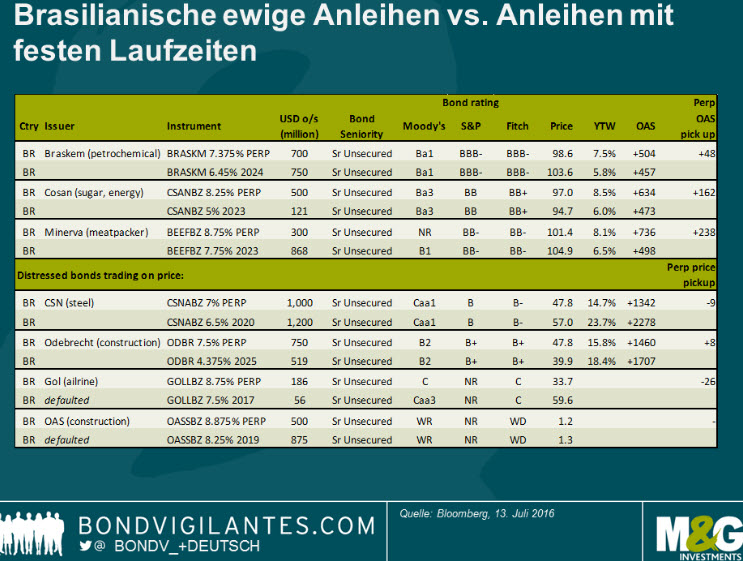 Sorgfältige Besitzer von ewigen Anleihen in Brasilien sollten unter Umständen ihre Anleihenratings intern um eine Stufe senken und sicherstellen, dass sie für ihre Risiken entschädigt werden. Dies umso in einem Land mit erhöhten Ausfallraten und einer hohen Wahrscheinlichkeit weiterer Umtausche von Verbindlichkeiten in den kommenden 12 bis 18 Monaten.