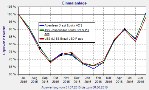 1. Auf dem dritten Rang hat der UBS (Lux) Equity Sivac – Brazil “nur“ ein Verlust von 2,29 Prozent (Stand 30. Juni 2016) gemacht. Seit Beginn des Jahres ging es sogar um 44,73 Prozent nach oben. Der Fonds ist zu 100 Prozent in Aktien investiert – das Portfolio ist relativ stark konzentriert. Dabei machen Banken und Finanzdienstleister zusammen rund 30 Prozent der Branchengewichtung aus.