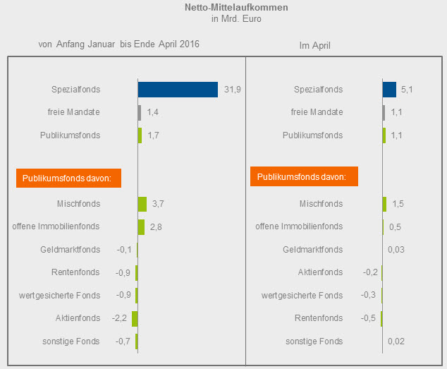 Noch im März hatte der Zufluss an frischem Geld bei 4,2 Milliarden Euro gelegen. Besonders Spezialfonds treiben das Geschäft: Seit Anfang Januar 2016 fließen ihnen 31,9 Milliarden Euro an neuen Mitteln zu. Publikumsfonds steuern lediglich 1,7 Milliarden Euro bei. Davon stammen 3,7 Milliarden Euro aus Mischfonds und 2,8 Milliarden Euro aus offenen Immobilienfonds. Rentenfonds (Minus 0,9 Milliarden Euro) und Aktienfonds (Minus 2,2 Milliarden Euro) trüben das Ergebnis jedoch. Noch im April ziehen Anleger 0,2 Milliarden Euro aus Aktienfonds ab, während Mischfonds 1,5 Milliarden Euro an neuen Mitteln generieren.