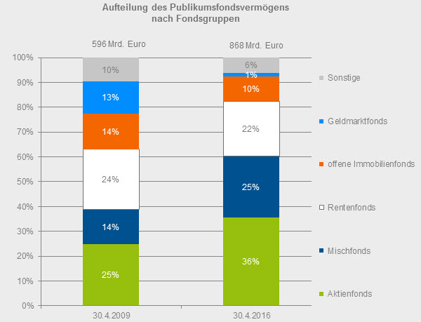 Insgesamt verwaltet die Fondsbranche per Ende April 2016 2,6 Billionen Euro. 868 Milliarden Euro entfallen dabei auf Publikumsfonds, 1,4 Billionen auf Spezialfonds. Nach wie vor stellen Aktienfonds die volumenstärkste Gruppe der Publikumsfonds dar. Seit Ende April 2009 stieg das von ihnen verwaltete Volumen von 148 Milliarden Euro auf 310 Milliarden Euro. Das macht einen Marktanteil von 36 Prozent aus. Auf aktiv gemanagte Aktienfonds entfallen 228 Milliarden Euro, auf Aktien-ETFs 82 Milliarden Euro. Damit sind 26 Prozent des Vermögens von Aktienfonds ETFs.