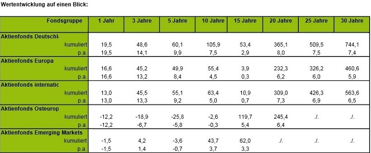 Die BVI-Statistik zeigt: Deutschland-Fonds liegen im Vergleich eindeutig an der Spitze gegenüber Aktienfonds, die europaweit, in Osteuropa oder international investieren (siehe Grafik). Auch eine weitere Erkenntnis sollte Anlegern Mut machen, ihr Geld in Fonds anzulegen, die in deutsche Aktien investieren: Über die vergangenen fünf, zehn, 20, 25 oder 30 Jahre hinweg haben die Fonds durchschnittlich niemals einen negativen Ertrag erzielt.