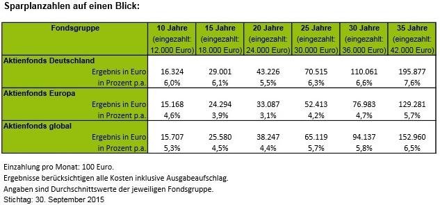 Neben der Wertentwicklung für verschiedene Aktienfondskategorien ermittelte der BVI auch die Wertentwicklung von Sparplänen in Aktienfonds. Demnach haben Anleger, die 25 Jahre lang monatlich denselben Betrag in einen durchschnittlichen Aktienfonds mit Schwerpunkt Deutschland investiert haben, eine Rendite von über sechs Prozent erzielt. Nicht unerheblich bei diesem Wert: In diesem Zeitraum fanden zwei Finanzkrisen mit erheblichen Verwerfungen an den Aktienmärkten statt. Durchhaltevermögen zahlt sich also tatsächlich aus.