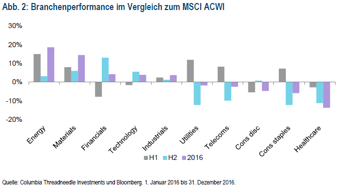 Dieser Ansatz machte sich bis zur Jahresmitte 2016 bezahlt, da defensive Versorger-, Telekommunikations- und Basiskonsumgüterwerte sowie zyklischere Grundstoff- und Energiewerte überdurchschnittliche Renditen abwarfen. In der zweiten Jahreshälfte kam dann aber wieder alles ganz anders. Nachdem das Brexit-Votum die Märkte kalt erwischt hatte, drehte die Stimmung. Die dadurch ausgelöste Verunsicherung wurde im Vorfeld der Präsidentschaftswahlen in den USA und durch den Wahlsieg von Donald Trump nochmals verstärkt. Trotzdem schlossen die Märkte das Jahr mit einem scheinbar größeren Wachstumsoptimismus. In den USA profitierten binnenwirtschaftlich orientierte Unternehmen von Trumps ‚America First‘-Rhetorik. Außerdem stellte der designierte Präsident Deregulierungsmaßnahmen und Steuersenkungen für Unternehmen in Aussicht. Im Dezember wurde der amerikanische Leitzins zum zweiten Mal innerhalb von zwölf Monaten angehoben. In Europa konnten selbst die Unsicherheit über Großbritanniens künftige Rolle in der EU und ihre Auswirkungen auf die gesamte Region die Erholung der konjunktursensitivsten Unternehmen nicht dämpfen.